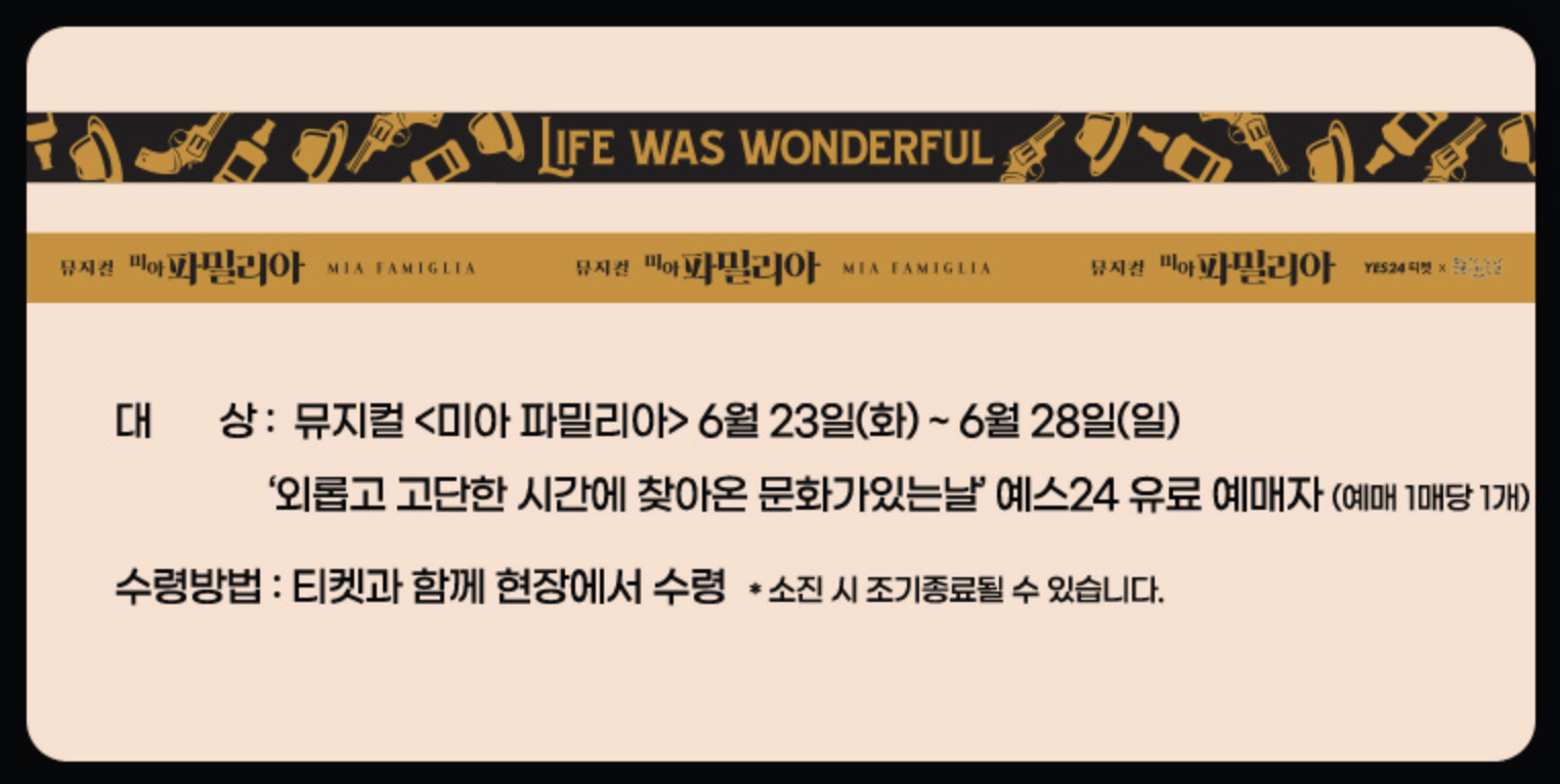 뮤지컬 [미아 파밀리아] 상세정보 장르: 뮤지컬 일시: 2020.06.09 ~ 2020.08.23 등급: 만 13세 이상 관람가 (중학생 이상 관람가) 관람시간: 110분(인터미션 없음) 장소: 예스24스테이지 2관