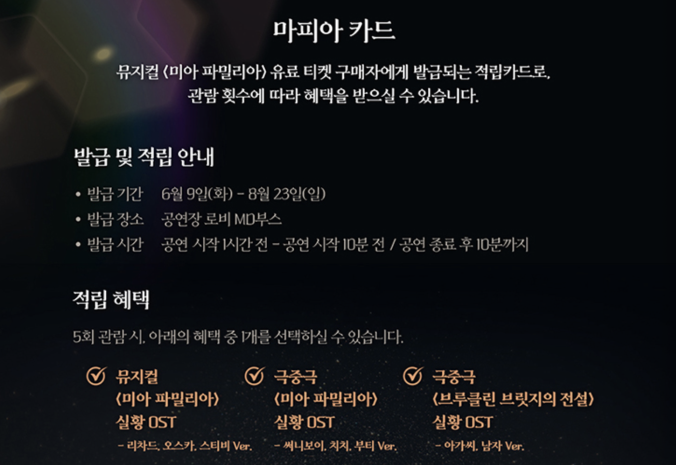 여기서 <마피아 카드> 란 유료 티켓 구매자에게 발급되는 적립카드로, 관람 횟수에 따라 발급되는 카드를 말한다.