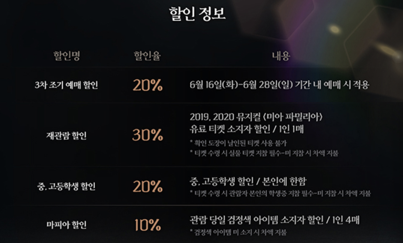 조기 예매 기간에 예매를 할 경우 20% 의 할인을 받을 수 있다. 이 포스팅이 업로드 되는 시점에는 3차 조기 예매 할인으로 6월 16일 부터 6월 28일까지 예매 기간에 적용받을 수 있다.